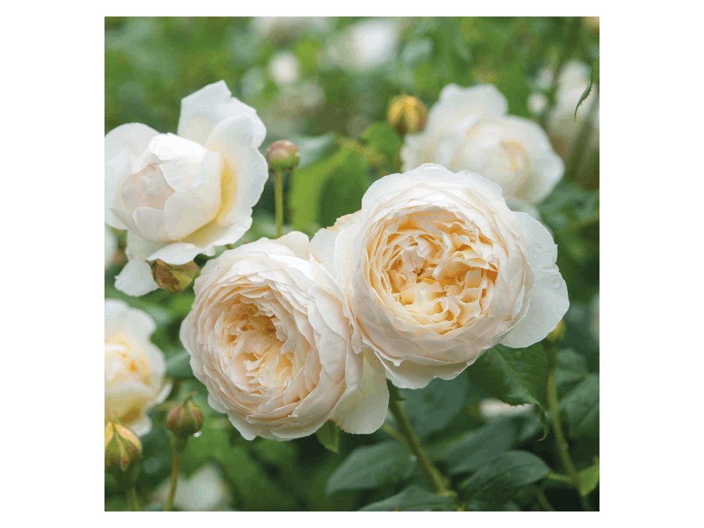 Její poupata mají citronový nádech a postupně se otevírají do velkých, krémově bílých růžic, jejichž vnější okvětní lístky jsou dokonale uspořádány.